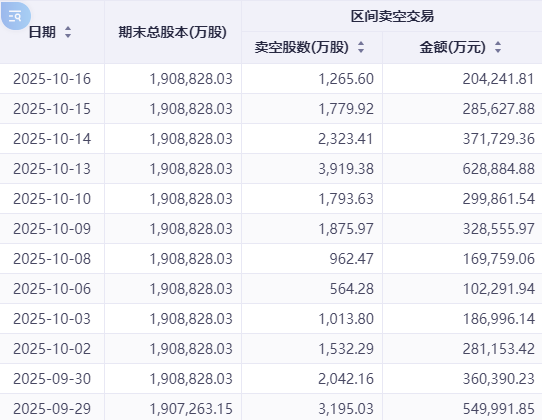 值得注意的是,港股卖空交易表现活跃,具体来看,从2025年10月2日到10月13日,总卖空成交量有明显的上升,而从10月13日到10月16日,总卖空成交量略有下降。