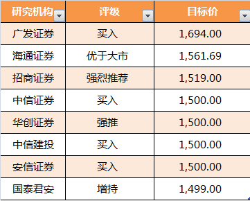 贵州茅台再次发力,股价大涨逾2%,现报1476元,距离1500元关口一步之遥。广发证券、海通证券、招商证券、中信证券、华创证券、中信建投、安信证券给予的目标价在1500元上方,目前广发证券、海通证券给予的目标价最高,分别为1694元和1561.69元。