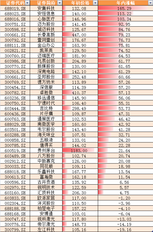 数据显示,今年年初,两市共有43只百元股,截至6月22日收盘,两市共87只百元股,百元股数量扩大了1倍。年初的43只百元股中,安集科技、安恒信息、心脉医疗年内分别上涨165.29%、113.22%、103.34%。迈为股份、诚迈科技、长春高新、壹网壹创、金山办公、凯莱英等年内涨幅超过70%,迈瑞医疗、兆易创新、新媒股份、深南电路、圣邦股份、德方纳米、深信服、卓胜微、移远通信、宁德时代、吉比特等年内涨幅超过50%。年初百元股中只有欧派家居、洋河股份、柏楚电子、安博通、锐科激光、帝尔激光、左江科技等7股下跌,锐科激光、帝尔激光、左江科技跌幅在10%-20%之间。总体而言,百元股群体中,年内上涨的个股比例高达近84%。