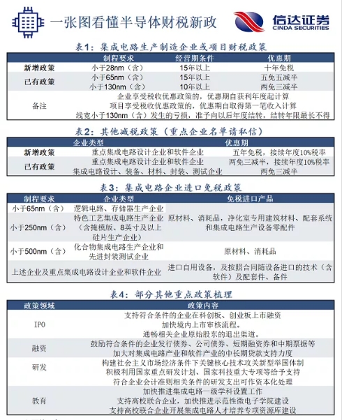 1)在现有的“五免五减半”政策基础上,首次推出十年免征所得税政策,支持28nm(含)及以下先进工艺生产企业发展;