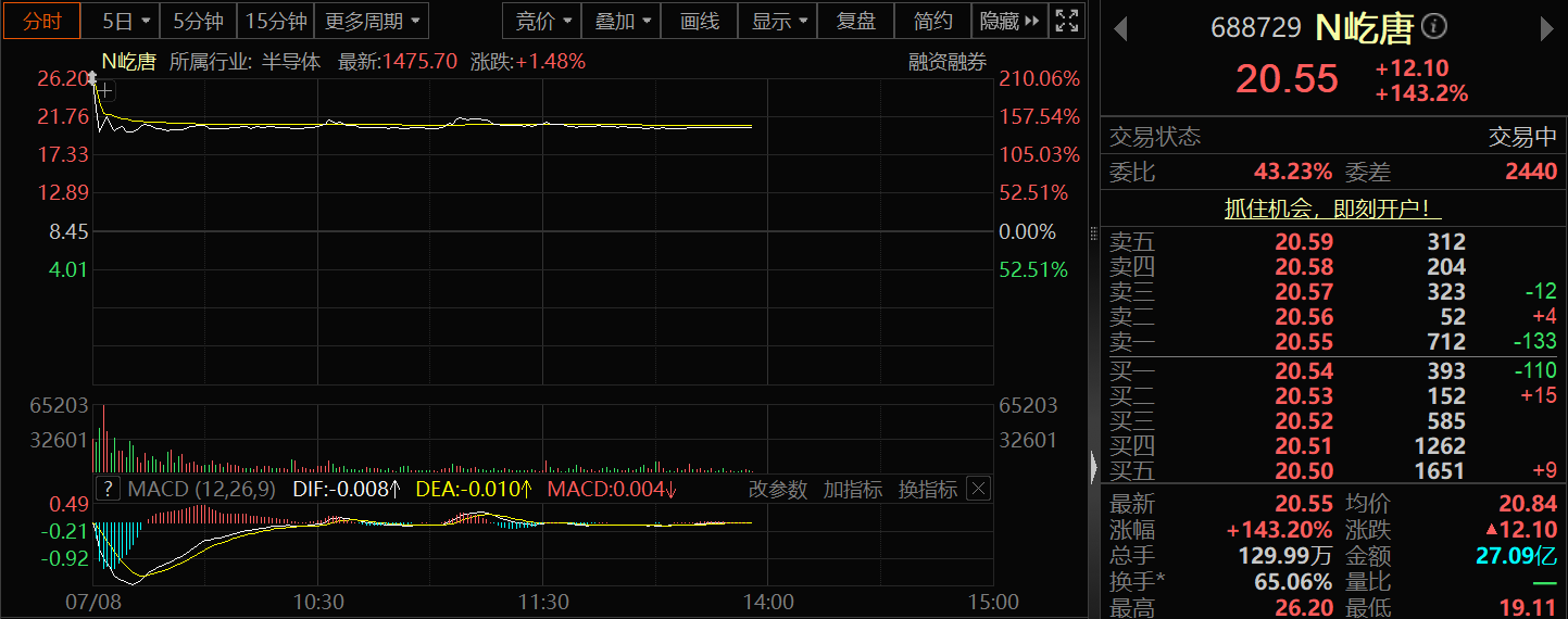 上市首日,屹唐股份开盘一度涨超200%,截至上午收盘,屹唐股份股价有所回落,报21元/股,股价上涨148.5%,换手率53.71%,成交额22.42亿元,总市值620.67亿元。