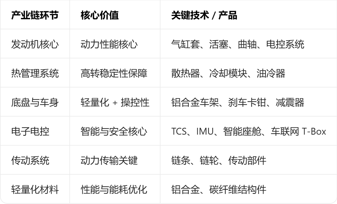 1. 核心零部件需求爆发:发动机、电控系统、热管理、轻量化结构件、刹车减震、智能网联等赛道订单放量,国产汽配企业从配套低端车型转向高端赛事 / 量产车型,技术与盈利水平提升。供应链协同强化,重庆 400 余家摩配企业形成快速响应体系,研发周期压缩至传统厂商 1/10。