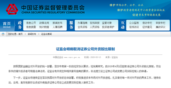证监会3月13日表示,按照国家金融业对外开放的统一部署,落实中美第一阶段经贸协议要求,经统筹研究,自2020年4月1日起取消证券公司外资股比限制,符合条件的境外投资者可根据法律法规、证监会有关规定和相关服务指南的要求,依法提交设立证券公司或变更公司实际控制人的申请。