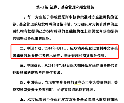 在2020年1月16日发布的《中美第一阶段经贸协议》4.7条中显示,中国不迟于2020年4月1日,应取消外资股比限制并允许美 国独资的服务提供者进入证券、基金管理和期货服务领域。