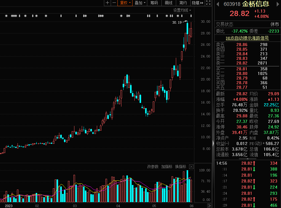 6月2日晚,金桥信息发布了大股东拟减持计划,公告称控股股东、实控人金国培拟减持不超过735.5万股,即不超总股本的2%。按6月2日收盘价计,减持金额约2.12亿元。