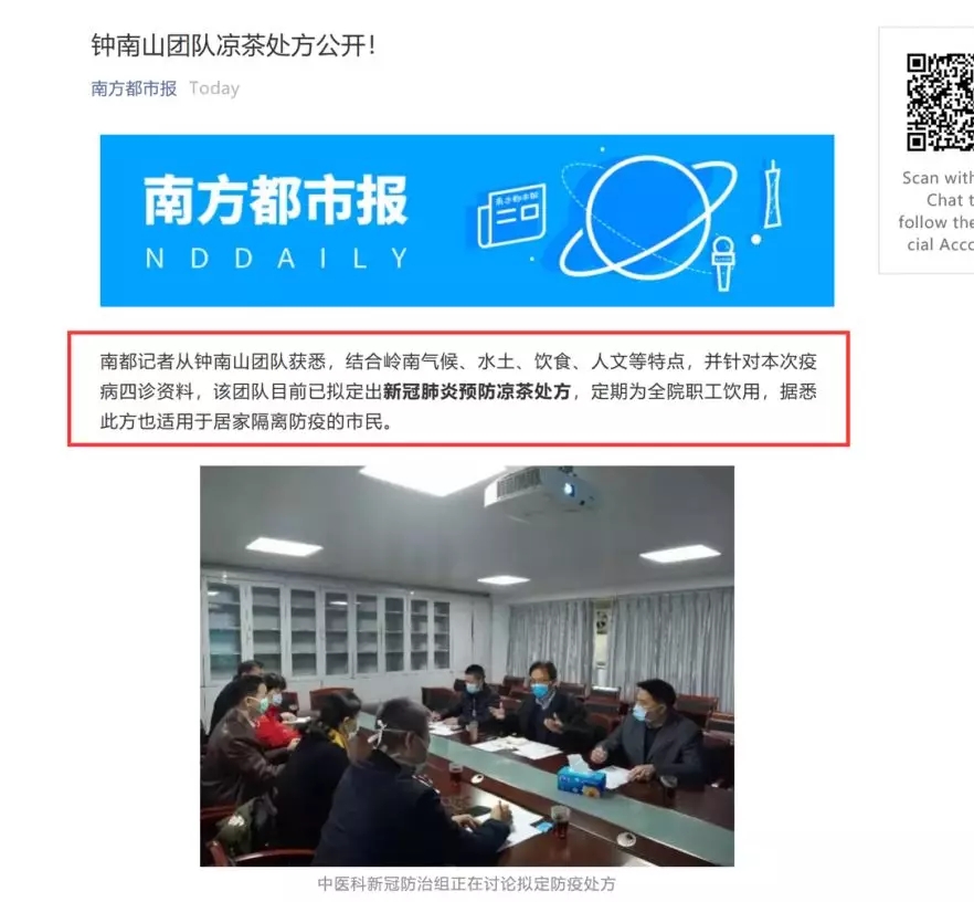 该报道中还称,该预防凉茶处方经一线医护人员服用后,身体状况一致反应良好,得到了不少医护人员的青睐。