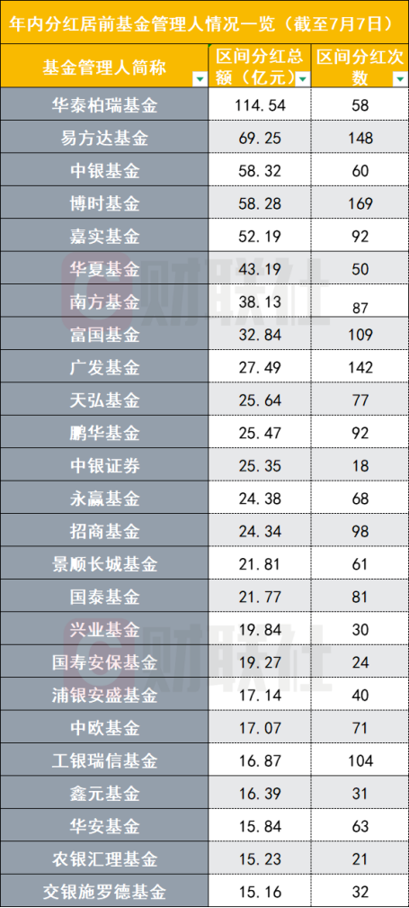 从基金管理人的维度来看,头部ETF管理人的优势也较为显著。截至7月7日,华泰柏瑞基金以114.54亿元的年内分红总额暂时领先,也是年内唯一一家分红总额超百亿元的公募管理人。