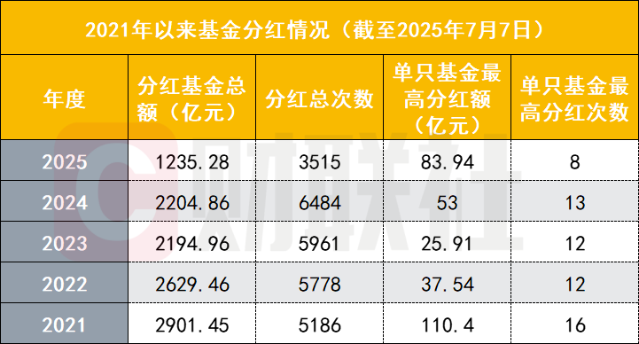 在此之前,Choice数据显示,截至7月7日,年内有2335只基金(同一基金不同份额分开计算)合计分红3515次,合计分红总额达到1235.28亿元。与去年同期相比,分红总额和分红次数分别增加了38.24%、19.48%。