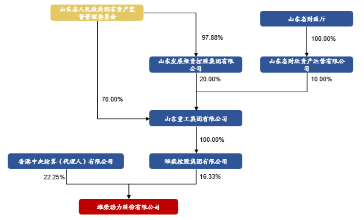 股权结构看,第一大股东为潍柴控股,持股比例16.30%,山东重工100%持有潍柴控股股份,潍柴动力实控人为山东国资委。