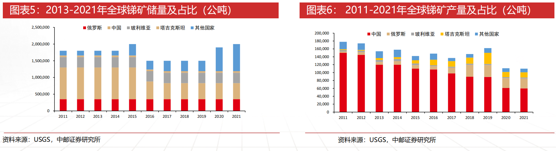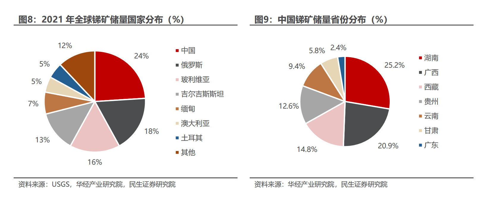 我国锑储量及矿山锑产量世界第一,2021年我国锑储量为44.9万吨、矿山锑产量6万吨,全球占比分别为24%和55%。自2019年来锑矿产量持续收缩,供需逐渐趋紧。