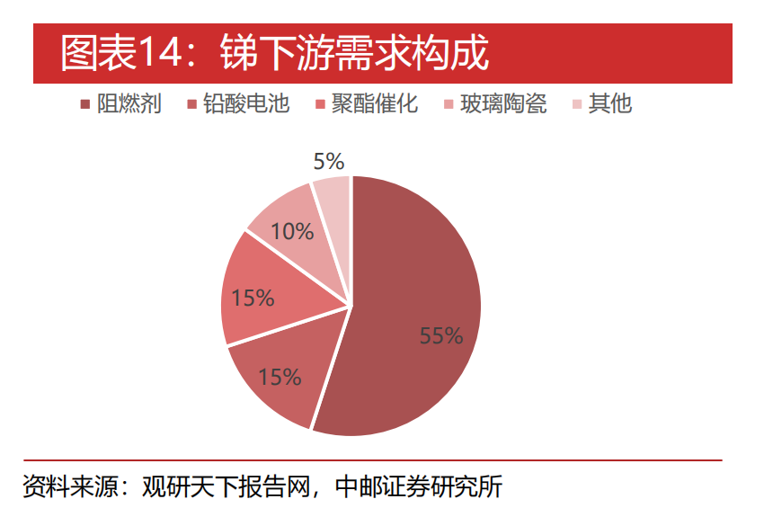 目前,锑的传统下游消费主要分布在四大领域。阻燃剂为其主要应用场景,占比达到55%;铅酸电池、聚酯催化和玻璃陶瓷分别占比15%、15%、10%。