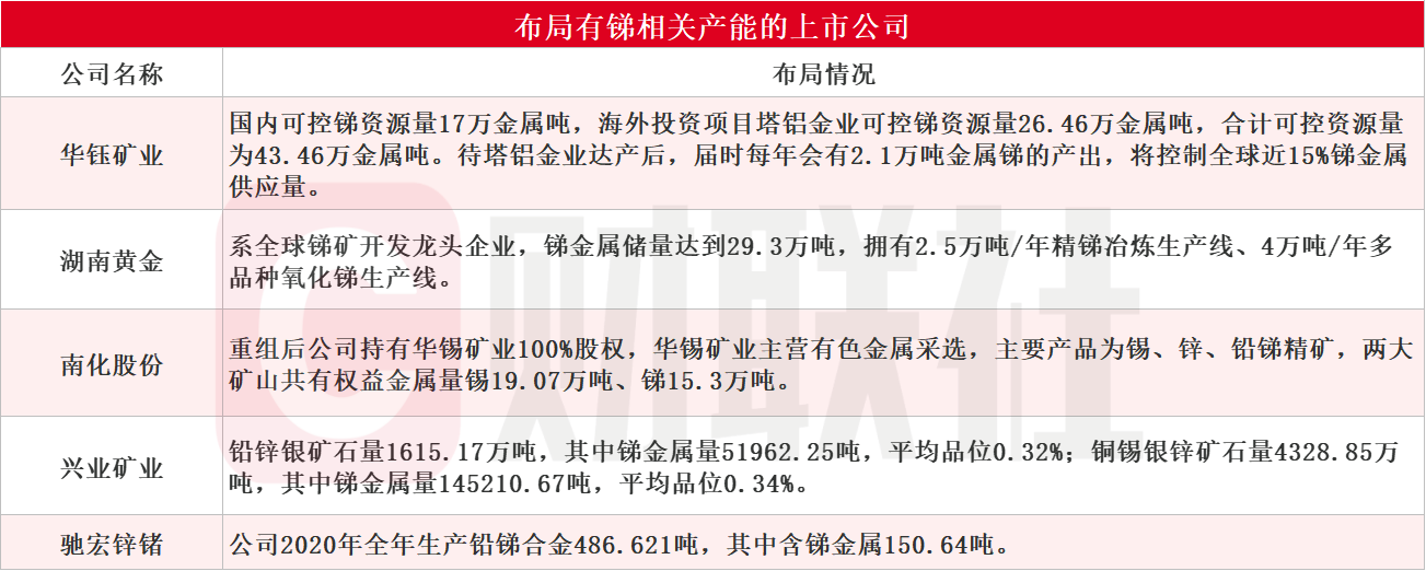 据财联社不完全整理,布局有锑相关产能的上市公司主要包括华钰矿业、湖南黄金、南化股份、兴业矿业、驰宏锌锗等,具体情况如下: