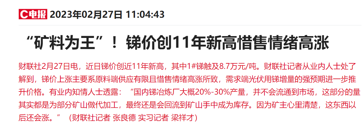 财联社记者从多位业内人士处获悉,锑价上涨主要系原料端供应有限且惜售情绪高涨所致,同时需求端随着传统消费领域的复苏以及光伏用锑的强预期进一步推升其价格上扬,市场对未来长期锑价仍然看好。