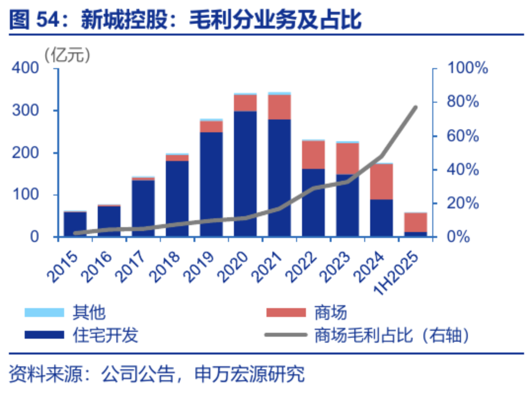 “商业+住宅”双轮驱动,商业板块提供核心安全垫与增长极:公司长期坚持“商业运营+地产开发”的双轮驱动模式,核心竞争力在于其商业板块“吾悦广场”的成功运营。商业运营业务提供稳定且高毛利的现金流,有效对冲了住宅开发业务的周期性波动。2025年上半年,物业出租及管理业务毛利率高达71.20%,其毛利贡献占比已从2023年的32.73%提升至2024年的47.89%,预计未来将超过60%。随着住宅开发业务规模收缩,公司将加速向一家以商业运营为主的资产管理公司转型,其盈利的稳定性与质量将持续提升,驱动估值体系从传统开发商向商业REITs靠拢。