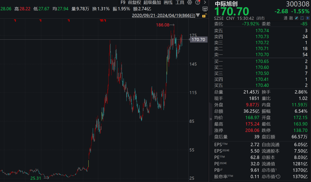 与亮眼的业绩相映衬,中际旭创在二级市场亦大放异彩。2023年以来,公司股价上涨超5倍,最新收盘价为170.7元/股,市值1370.42亿元。