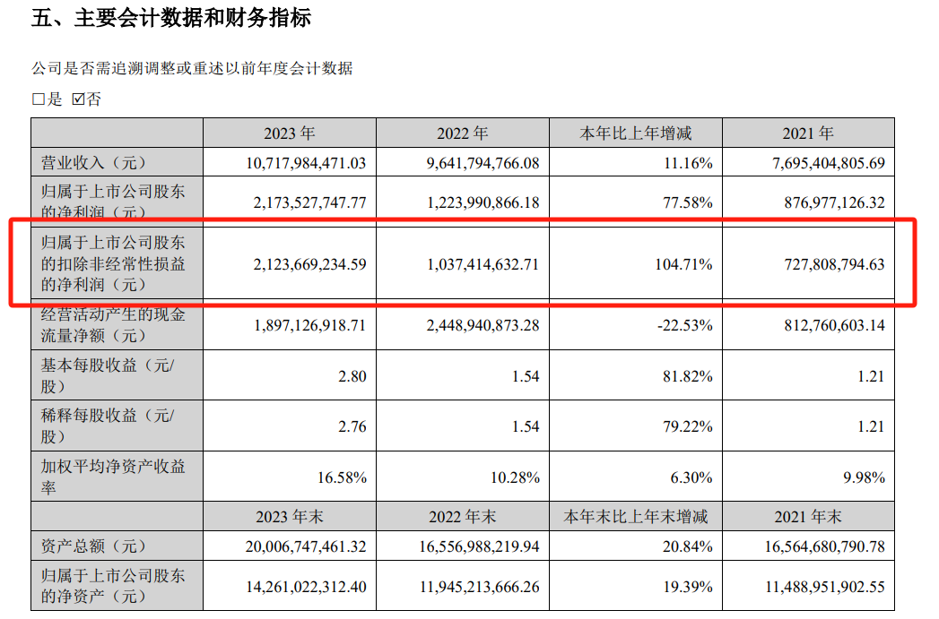2023年实现营收107.18亿元,同比增长11.16%;净利润21.74亿元,同比增长77.58%;扣非后净利润21.24亿元,同比增幅达104.71%。
