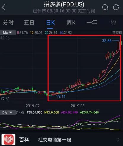 这一轮拼多多股价的大涨起步于7月15日左右,股价从19.11元暴涨到了上周四最高的33.88元,短短一个多月暴涨77%。