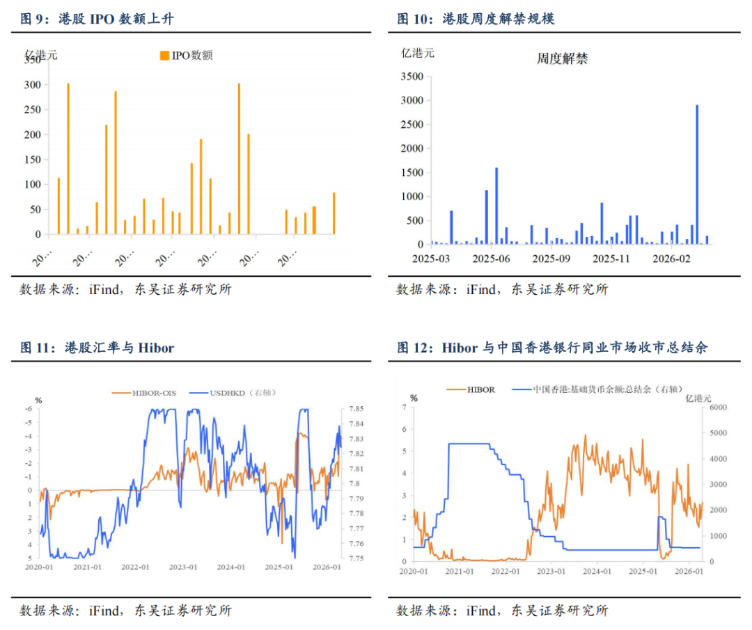 上周港股回购32亿港元,较上周减少4亿港元;上周IPO数额82亿港元,比上周增加82亿港元;解禁市值为112亿港元,较上周减少52亿港元。