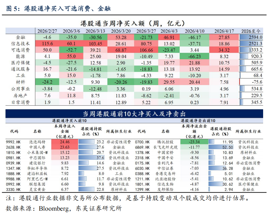 上周回顾(2026/4/13-4/17):全球主要市场普遍走强,涨幅居前的为纳斯达克指数、韩国综合指数、标普500,涨幅最小的为英国富时100。港股全部上涨,恒生科技上涨3.8%,恒指上涨1.0%,恒生中国企业指数上涨2.2%。行业上,非必须消费(+4.4%)、医疗保健业(+2.0%)、资讯科技业(+2.1%)领涨;必需性消费(-3.1%)领跌。