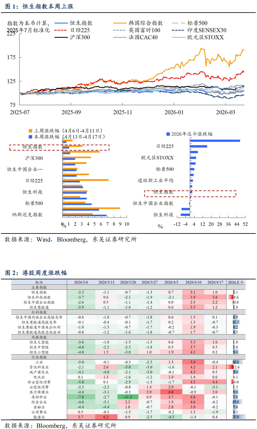 上周港股反弹。市场在地缘冲突的尾部风险大幅下降后进一步走强:地缘层面,虽然美伊谈判进程反复摇摆,特朗普多次释放“战争接近结束”的缓和信号提振市场。临时停火期间,当地时间4月16日,美国又宣布对伊启动“经济狂怒”制裁并威胁封锁霍尔木兹海峡,但烈度最大的时刻和进一步升级的概率大幅减弱。行业层面,港股科技受益于海外科技的大反弹,迅速修复;同时,医疗保健业上涨,主要受到监管机构发布优化创新药定价机制新规的提振。