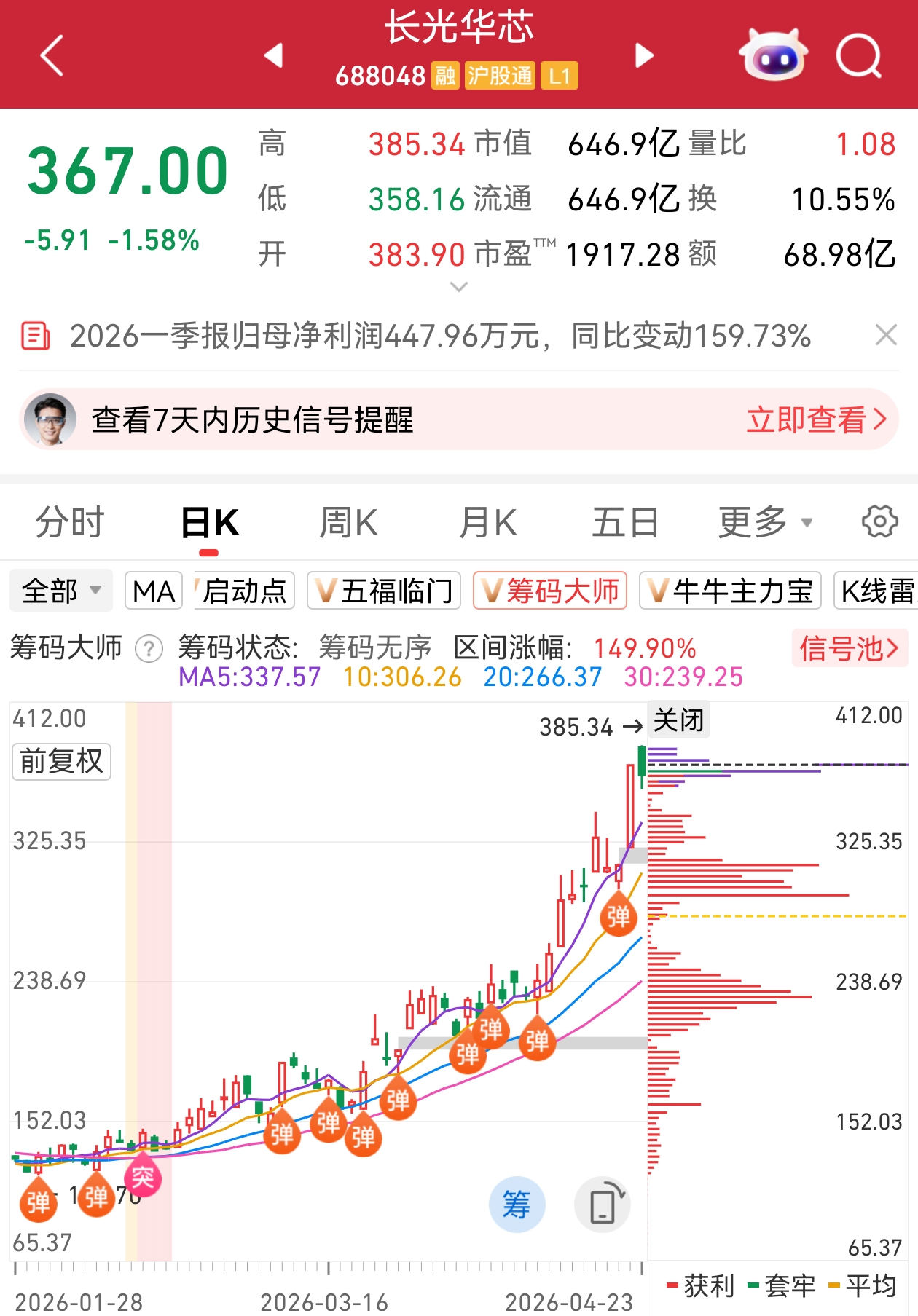 注:主升浪并非完全无迹可寻!“筹码大师”显示,长光华芯前期连续密集出现“突”、“弹”信号,短短一个多月时间里,合计出现“突”信号1次,出现“弹”信号9次,最后一次出现则是在4月21日,随后马上拉出20厘米涨停!那么,你的股有没有强势信号出现?还有哪些股出现了强势信号呢?更多学习案例参考,尽在“筹码大师”!点击详情>>