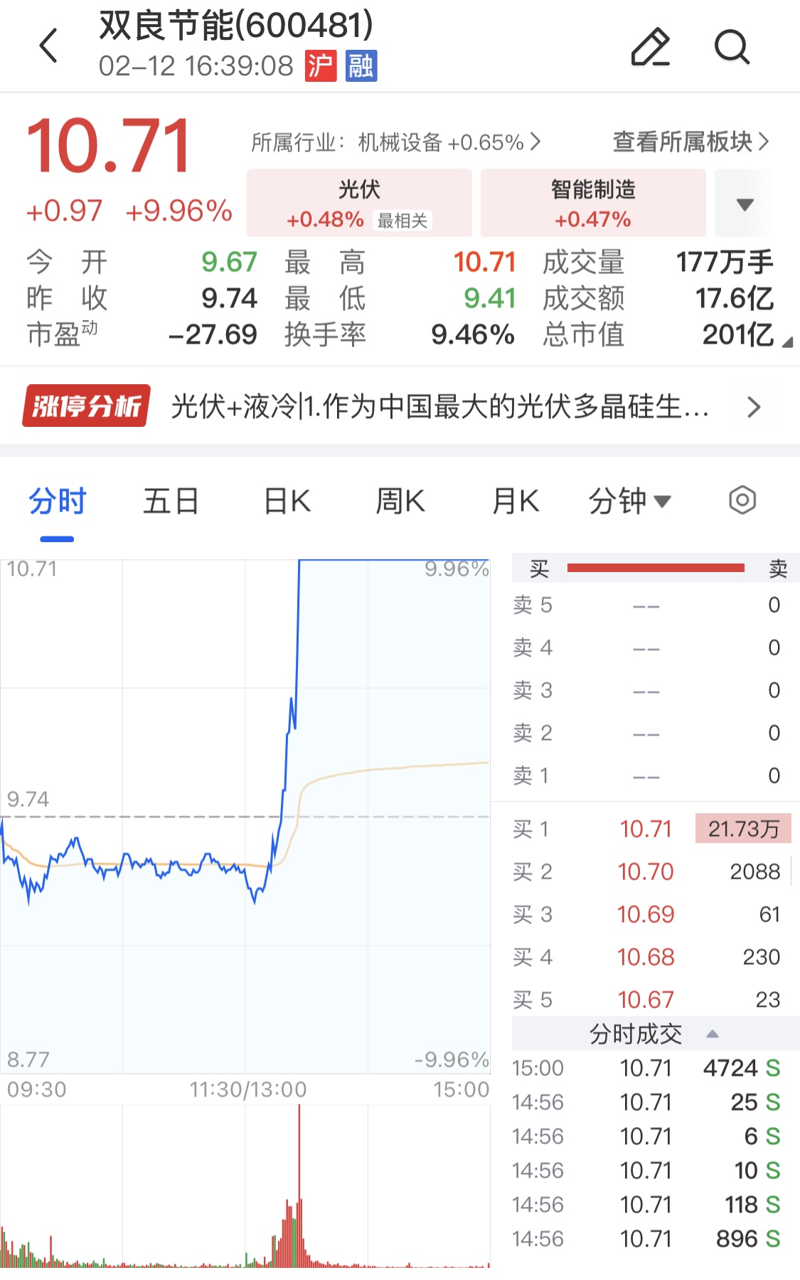 今日午后开盘10分钟左右,双良节能股价异动,并快速拉向涨停。截至收盘,其股价报10.71元/股,市值为201亿元。消息面上,今日13:02,双良节能在微信公众号上发布“近日再获3个海外订单”消息,而交易关联方正是马斯克旗下太空探索技术公司Space X。