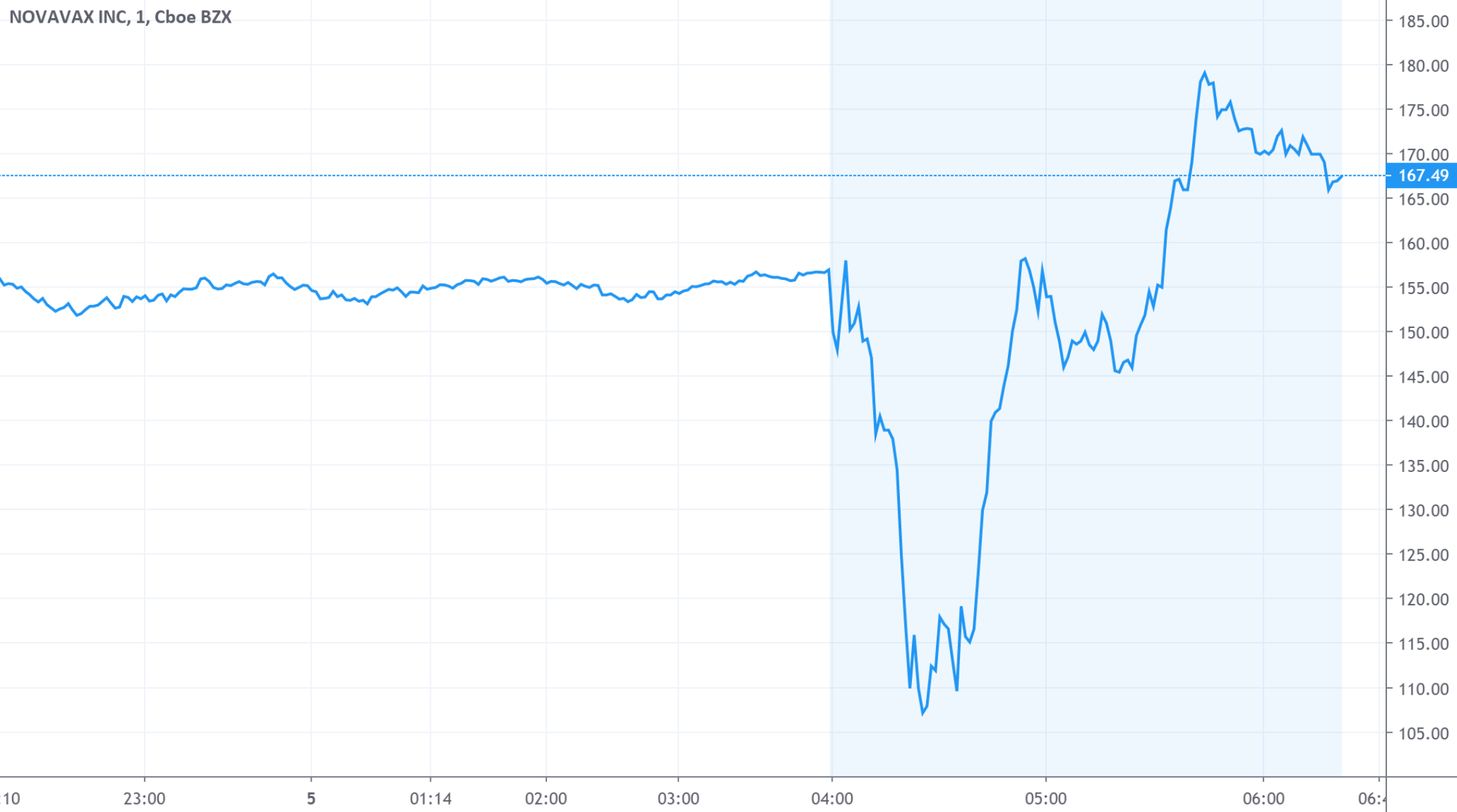 就在等待“辟谣”的半个小时里,诺瓦瓦克斯股价在盘后出现了异动,从当天收盘价157.17美元直线跳水至103美元,跌幅达到33.52%。随着公司澄清相关事宜,股价迅速回升并报收8.8%。