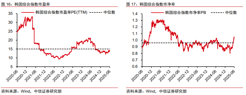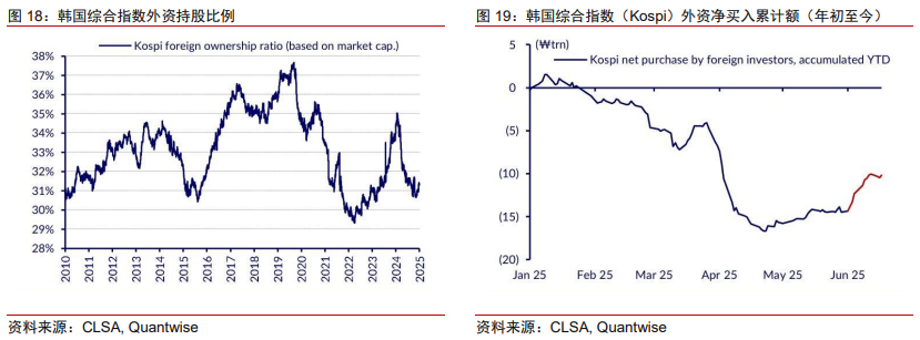 韩国股市:政策支持+流动性注入预期,有望保持积极态势。尽管近期韩国股市强劲反弹上涨,从历史估值等因素来看,中信认为这更多是由深度折价的估值修复驱动,而非全面重估。李在明政府已经着手提振韩国经济,且对股市尤为重视。李在明曾多次强调,新政府将通过支持股市而非房地产为韩国民众创造财富,例如李在明在竞选活动中曾喊出“KOSPI指数冲击5000点”、“终结‘韩国折价’现象”等口号。韩国《商法》修订有望尽快通过,持续改善公司治理。此外,韩国本轮宽松周期,鉴于政府对股市的战略推动,有望引导资金更多流入股市,同时外资及散户资金有望继续流入韩国股市。①外资动向:2025年初至5月份,外资净卖出Kospi成分股10万亿韩元,但6月份已转为净买入;目前外资持有Kospi成分股的比例为31.4%,接近2022年9月29.3%的15年低点。②散户潜力:从近期投资者存款增加和现金余额来看,预计散户资金将加速流入。中信预计韩国股市仍将保持积极态势,建议重点关注结构性增长板块,如造船、国防、韩国文化相关产业、医疗美容和核能领域;同时出口板块有望随着韩美关税谈判进展而复苏,例如半导体、医疗保健和汽车等主要出口行业。
