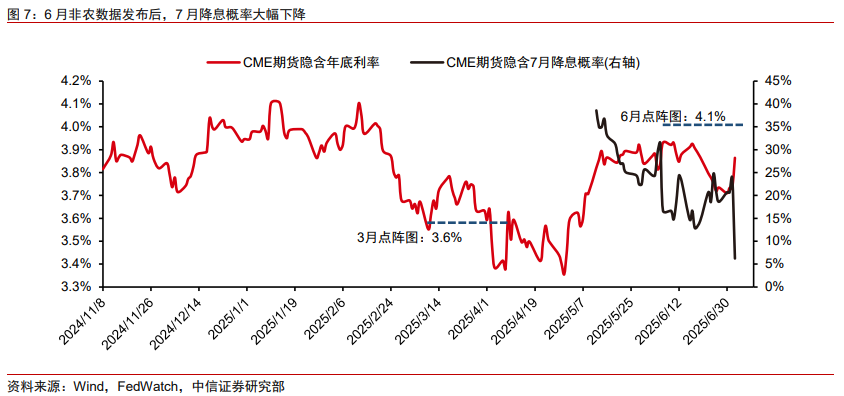 3)对等关税难回极端,中美关系有望延续稳态,风险偏好延续回暖。当地时间7月7日,特朗普事实上延长了此前设定的7月9日对等关税豁免截止日。关于后续走向,此次特朗普信函所设关税或并非最终结果,预计7月各国仍会推进同美国的贸易谈判,若达成协议则关税可能进一步降低。关于中美关系,短期内中美博弈或并非特朗普关注的焦点,中信预计中美关系将继续处于阶段性稳态,也可关注后续特朗普或访华以推动局部交易的可能性。
