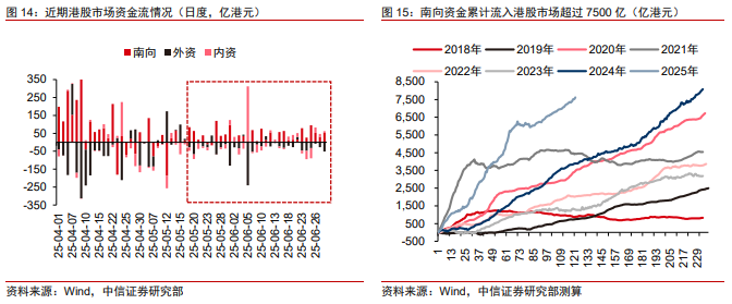 港股:性价比依旧显著,流动性充裕。港股目前估值相较亚洲其他市场仍具吸引力,恒生综指和恒生科技指数动态市盈率也处于历史低位,横纵向对比港股的性价比依旧显著。今年以来南向资金累计流入超7600亿港元,成为市场核心支撑。当前市场20日平均成交额仍超2300亿港元,处于历史较高水平;卖空金额占比相较4月初下降明显,情绪明显回暖。另外,5月初Hibor开始暴跌的时点与亚洲货币指数开始升值的时点高度吻合,反映“去美元”背景下,亚洲资金也在减持美元资产并流入香港市场。短期港股虽将面临美国债务和贸易摩擦风险,但美联储降息预期及内地政策空间扩大与落地,叠加中报利空出尽,港股有望迎来新的行情。行业配置上,建议关注:①科技板块,包含预计受苹果手机与国内AI眼镜上市催化的消费电子产业链,与潜在新模型发布或催化的AI软硬件;②流动性催化,内外部政策环境逆转和基本面改善的创新药;③在内地低利率环境大逻辑下,持续受益险资流入的红利板块,主要为银行。若美联储下半年降息,本地地产和高股息公用事业板块也具备投资潜力。