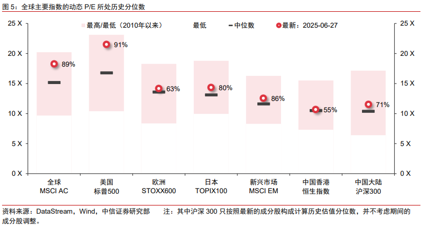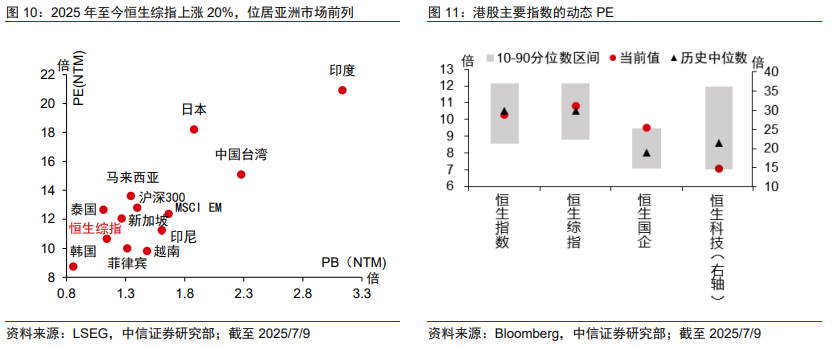 2)非美资产配置偏好上升,港股等新兴市场权益资产表现亮眼。根据BofA Global Fund Manager Survey,54%的投资者认为未来五年美国以外的国际资产最具增长潜力。2025年以来(截至6月30日),MSCI-新兴市场涨幅达14.2%,大幅跑赢MSCI-发达市场的8.1%,其中韩国KOSPI指数、中国香港恒生指数表现尤为亮眼,分别录得27%、21%的涨幅。当前中国市场依然是估值洼地,恒生指数、沪深300指数的相对估值水平、绝对估值分位水平均显著低于美股、日股等市场。