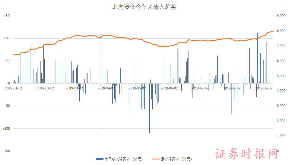 数据显示,自今年8月8日以来,北向资金基本上都是呈现持续净买入状态,期间累计净买入金额达到662.66亿元,其中,北向资金借道沪股通净买入354.86亿元,借道深股通净买入307.80亿元。
