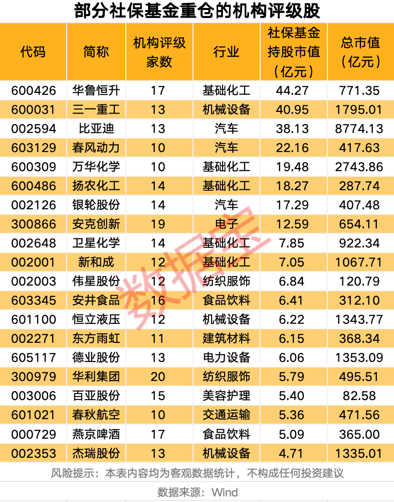机构评级家数居前的个股通常业绩稳健、财务健康,因而更易获得机构投资者的青睐。统计显示,上述机构评级家数不少于10家的70股中,28股2025年末获社保基金重仓,合计持股市值达到303.36亿元,华鲁恒升、三一重工获社保基金持股市值超过40亿元,分别达到44.27亿元、40.95亿元。