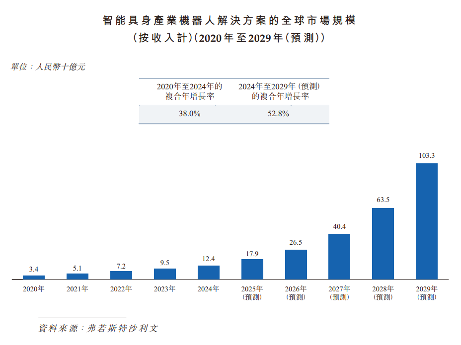 智能具身产业机器人解决方案的全球市场正进入加速增长阶段,这得益于技术进步和不断扩大的工业应用。按市场规模统计,智能具身产业机器人解决方案在具身AI机器人解决方案市场中的渗透率持续提升,从2020年的9.0%预计提升至2029年的36.8%。2020年至2024年,智能具身产业机器人解决方案的全球市场规模从2020年的人民币34亿元增长至2024年的人民币124亿元,复合年增长率为38.0%。到2029年,市场规模预计将达到人民币1,033亿元,2024年至2029年的复合年增长率为52.8%。