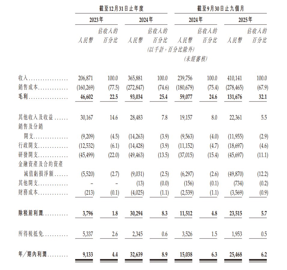 于2023年度、2024年度、2024年以及2025年截至9月30日止九个月,玖物智能实现收入分别约为2.07亿元、3.66亿元、2.40亿元、4.10亿元人民币。