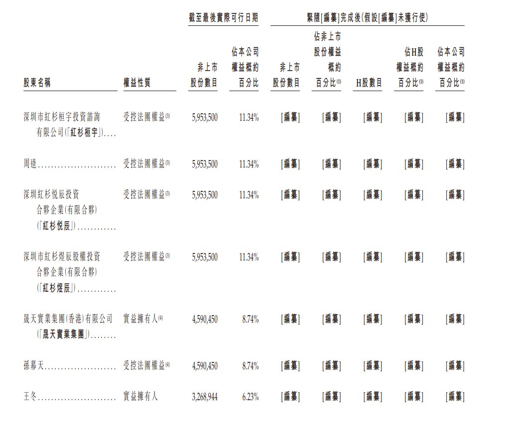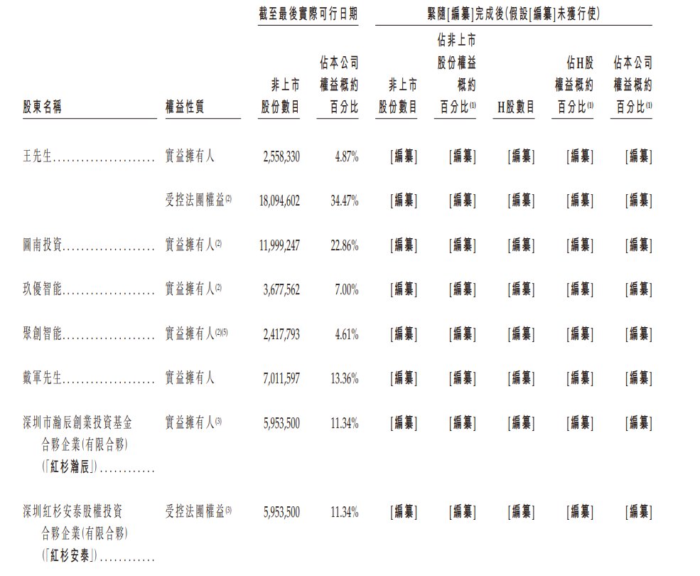 王先生持股4.87%,苏州图南投资合伙企业持股22.86%,苏州玖优智能技术合伙企业持股7%,聚创智能持股4.61%,戴军持股13.36%,深圳瀚辰创业投资基金合伙企业持股11.34%。截至最后实际可行日期,王先生为图南投资、玖优智能及聚创智能的普通合伙人。因此,根据证券及期货条例,王先生被视为拥有图南投资、玖优智能及聚创智能所持股份之权益。