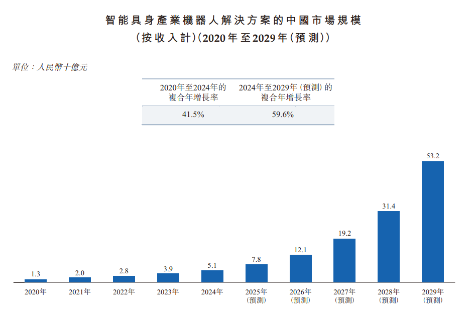 招股书显示,玖物智能是中国领先的智能具身产业机器人公司。根据弗若斯特沙利文的资料,按2024年智能具身产业机器人解决方案的收入计,公司在中国排名第二,市场份额为5.9%。凭借自主研发的全栈式机器人技术,以及深厚的工业领域专业知识,公司主要为工业领域设计、开发及部署具备感知、决策及交互能力的多形态智能具身产业机器人。