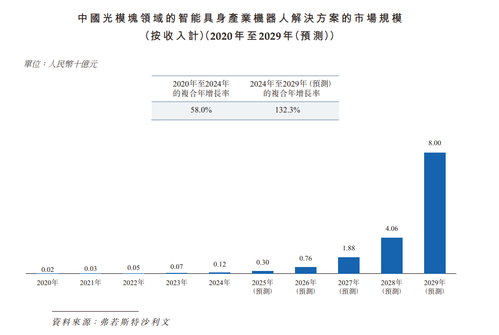 中国光模块领域正进入战略性增长阶段。在AI需求激增和网络升级加速的背景下,智能具身产业机器人正成为高速光模块和先进设备规模化生产不可或缺的设备。2020年至2024年,中国光模块领域的智能具身产业机器人解决方案的市场规模从2020年的人民币20.0百万元增长至2024年的人民币120.0百万元,复合年增长率为58.0%。展望未来,AI在光模块设计与测试环节的深度融合,结合智能具身产业机器人在量产中的渗透率持续提升,有望释放出呈指数级增长的市场潜力。到2029年,该市场规模预计将达到人民币80亿元,2024年至2029年的复合年增长率为132.3%,这标志著智能具身产业机器人已成为助力中国光模块产业提升全球竞争力的战略赋能工具。