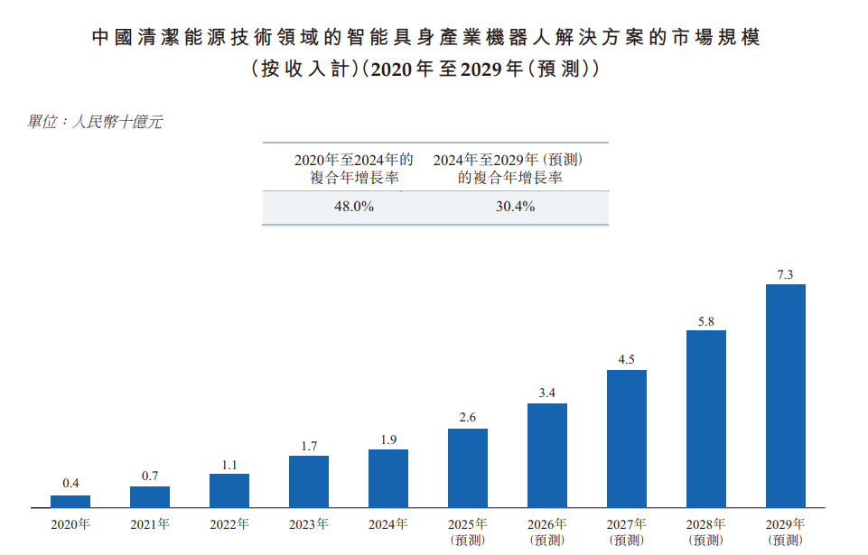 受锂电池和光伏制造产能快速扩张、对良率和柔性化要求提高,以及传统智能化解决方案局限性的驱动,智能具身产业机器人解决方案的需求大幅加速。2020年至2024年,中国清洁能源技术领域智能具身产业机器人解决方案的市场规模从2020年的人民币4亿元增长至2024年的人民币19亿元,复合年增长率为48.0%。展望未来,随著生产规模的持续扩大以及智能具身产业机器人解决方案的不断优化,有望推动该领域保持强劲的增长态势。到2029年,市场规模预计将达到人民币73亿元,2024年至2029年的复合年增长率为30.4%。