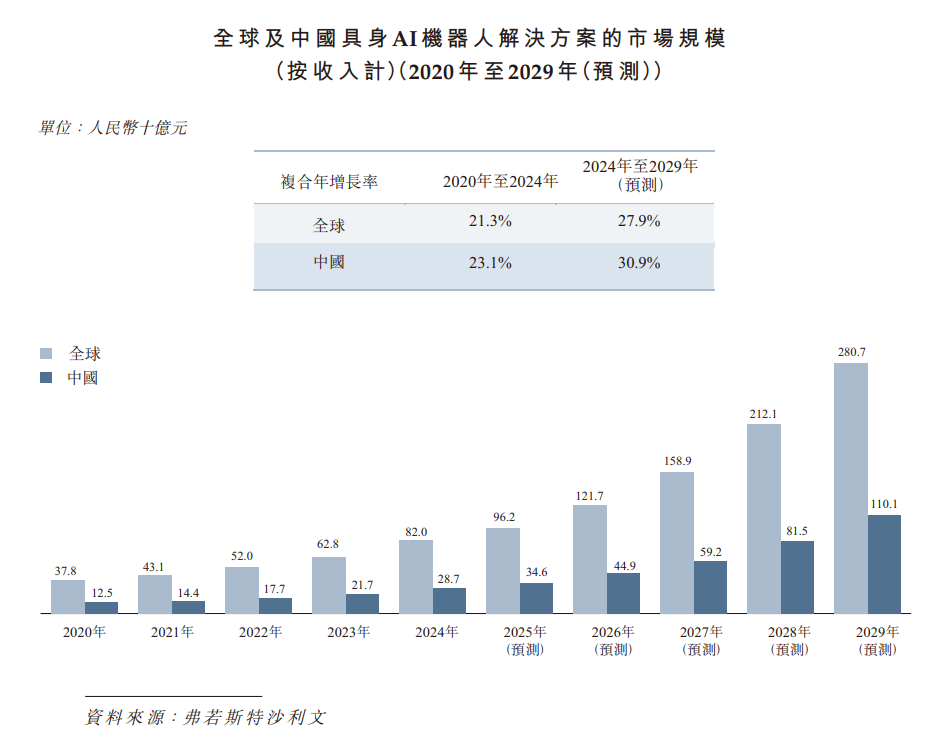 全球具身AI机器人解决方案市场规模从2020年的人民币378亿元增长至2024年的人民币820亿元,2020年至2024年的复合年增长率为21.3%。全球具身AI机器人解决方案市场规模预计到2029年将达到人民币2,807亿元,2024年至2029年的复合年增长率为27.9%。作为全球市场的核心增长引擎,中国具身AI机器人解决方案市场规模从2020年的人民币125亿元增长至2024年的人民币287亿元,2020年至2024年的复合年增长率为23.1%。中国具身AI机器人解决方案市场规模预计到2029年将达到人民币1,101亿元,2024年至2029年的复合年增长率为30.9%。