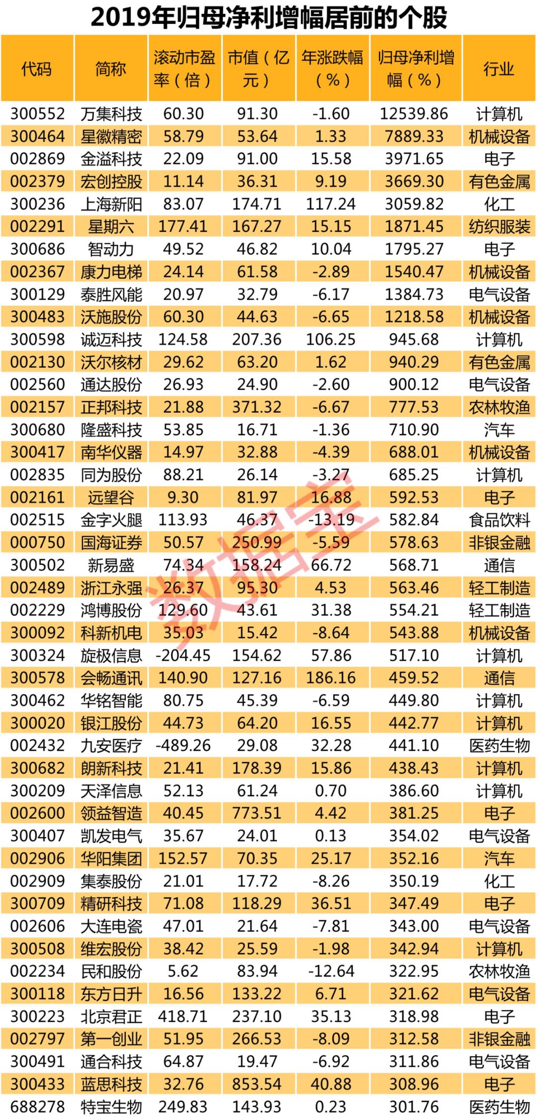 从业绩增幅来看,258只个股的归母净利增幅同比翻番,其中45股增幅超过了3倍,仅26股年内股价上涨,跑赢大盘的也仅33股。万集科技归母净利增幅高达12539.86%,其他增幅较高的还有星徽精密、金溢科技、宏创控股、上海新阳、星期六、智动力、康力电梯、泰胜风能、沃施股份,增幅都超过10倍。