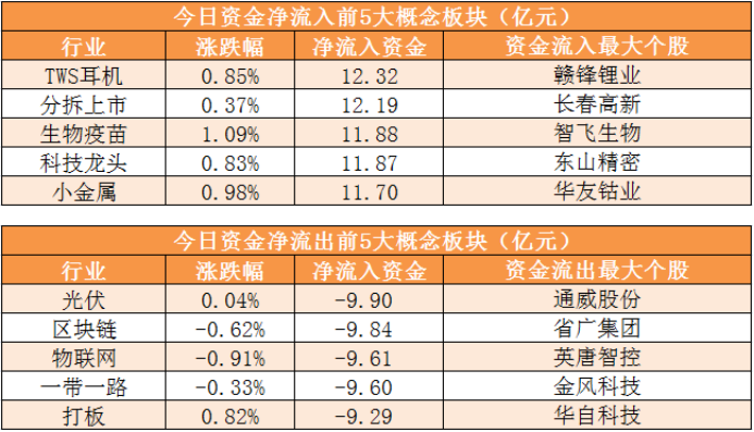 概念板块方面,今日TWS耳机、分拆上市、生物疫苗等概念板块资金呈现净流入,其中TWS耳机概念净流入12.32亿元居首。