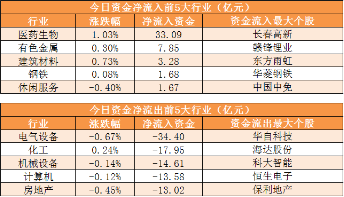 28个申万一级行业中,6个行业实现资金净流入,其中医药生物业净流入33.09亿元居首。