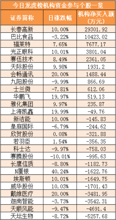 盘后龙虎榜数据显示,机构现身26股,其中长春高新等11股呈现机构资金净买入,天坛生物等15股呈现机构资金净卖出。