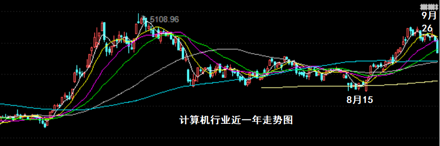 计算机的走势如下,从年初开始上涨到高点,后来经历了二季度的调整之后8月15日开始这一波行情,一直到9月中旬,又出现了调整迹象。坚持到了9月25和26两天终于扛不住了,出现大幅下跌。