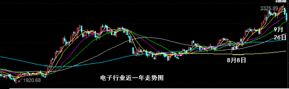 然后是电子板块,差别不大,第一波上涨高度没有计算机多,经历调整后的这一轮启动于8月8日开始,一直坚挺到9月24日,25和26两天出现大跌。