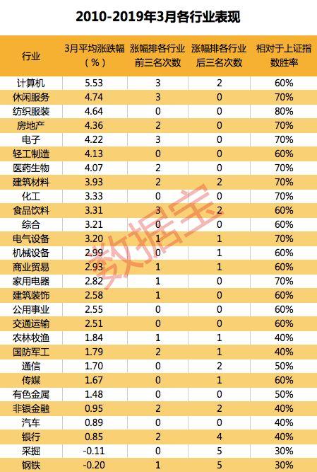 证券时报·统计,2010至2019十年中,上证指数在3月的涨幅有5次为正,未呈现出显著的月历效应,但部分行业的表现可圈可点。