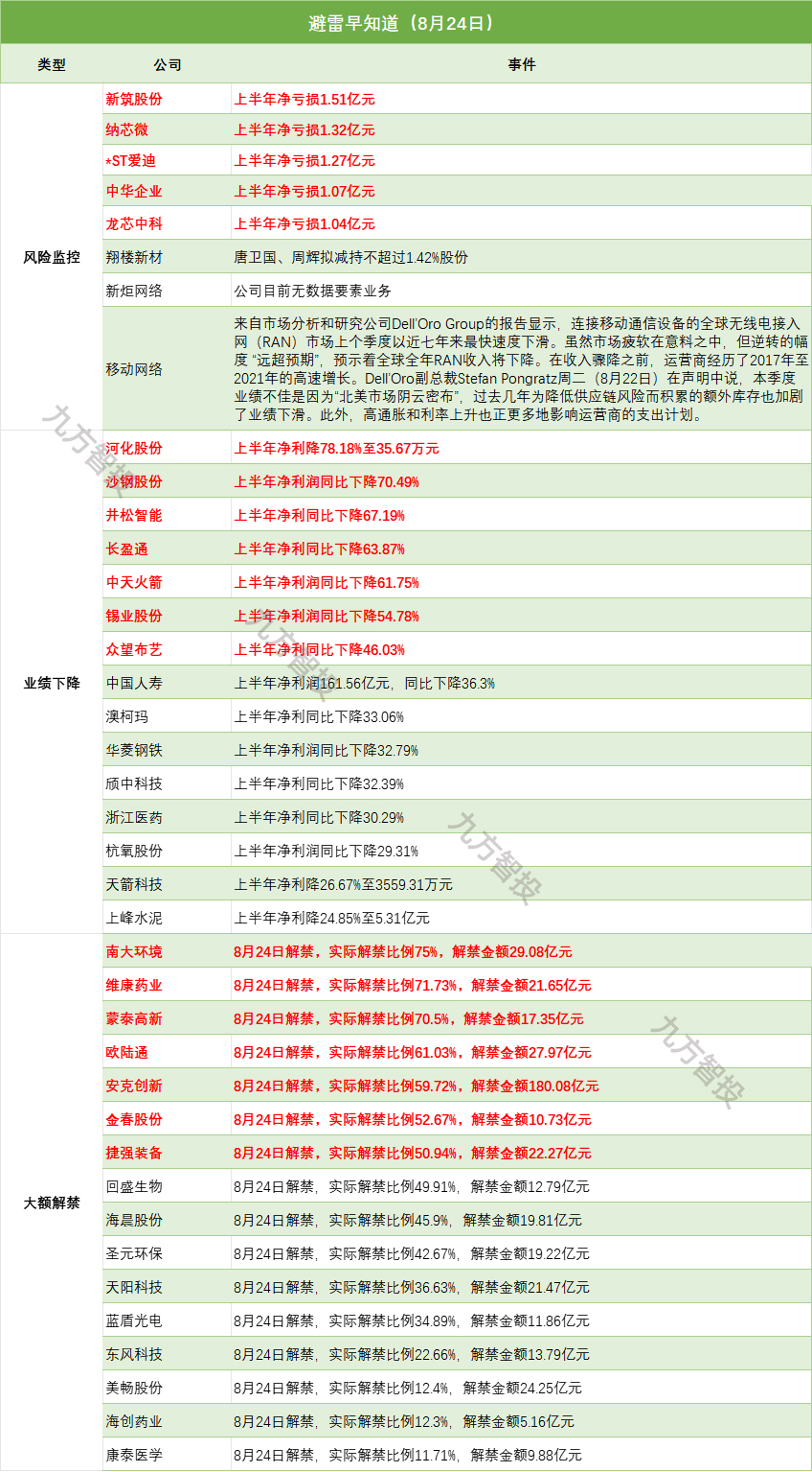 4)南大环境:8月24日解禁,实际解禁比例75%,解禁金额29.08亿元