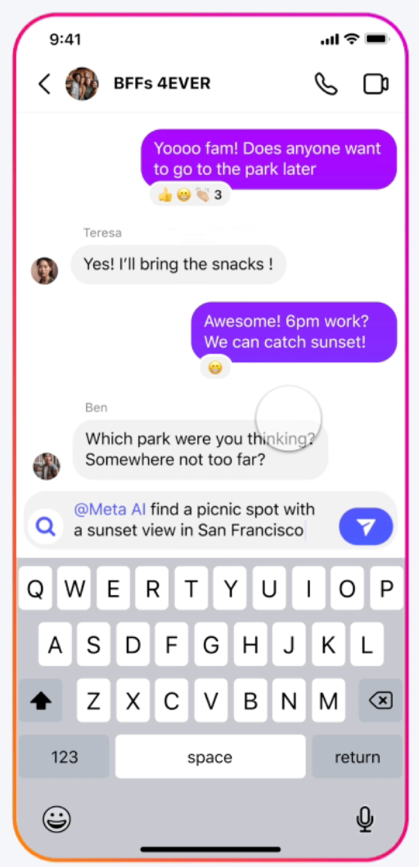 根据Meta展示的手机操作画面,用户在和朋友计划出行时,可以直接在聊天应用程序内“艾特”@Meta AI,帮助客户寻找旧金山可以看到日落的野餐地点,或者在日本旅游时寻找最佳的观赏樱花地点。