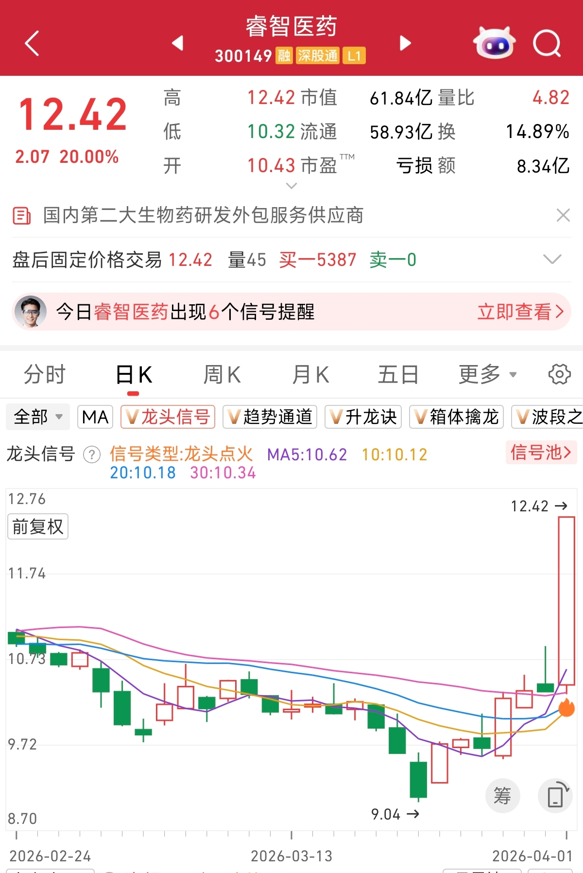 根据龙头信号监控,今日上涨的睿智医药,在4月1日出现龙头冲刺信号,感兴趣的朋友可以自行跟踪判断。